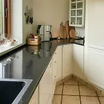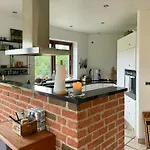 La villa Octagonal Thatched Forest House Near Herning dispone de una cocina bien equipada equipada con lavaplatos, cafetera/tetera y un horno.